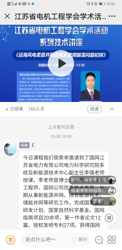 12月30日下午,江苏省电机工程学会成功举办系列技术讲座——《远海风电柔直并网进展及宽频振荡问题初探》。讲座采用网络直播方式进行,特邀国网江苏省电力有限公司电力科学研究院系统及新能源技术中心副主任李强博士主讲。省电机工程学会各会员单位、专工委会、学生分会160余人次在线观看了本次讲座。