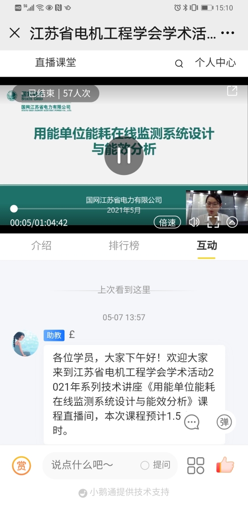 5月7日下午,江苏省电机工程学会举办2021年系列技术讲座第六期——《用能单位能耗在线监测系统设计与能效分析》。讲座采用网络直播方式进行,特邀国网江苏电力营销服务中心高级工程师苏慧玲博士主讲。省电机工程学会各会员单位、专工委会、学生分会以及省内有关电力能源企业相关专业人员共1700余人次在线观看了本次讲座。