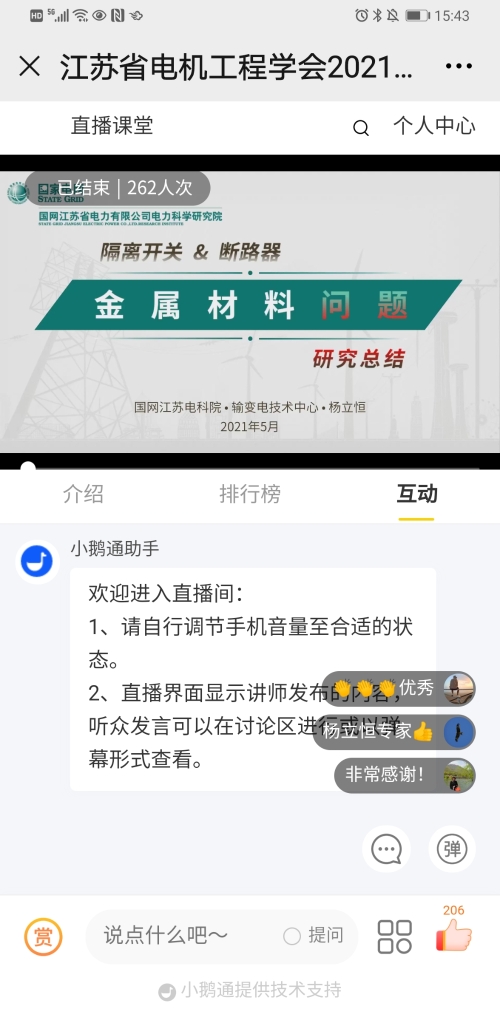 6月4日下午,江苏省电机工程学会成功举办系列技术讲座第八期——《隔离开关及断路器金属材料问题分析及提升措施》。讲座采用网络直播方式进行,特邀国网江苏省电力有限公司电力科学研究院金属及化学技术监督专责杨立恒主讲。省电机工程学会各会员单位、专工委会、学生分会和全国电网金属监督运维人员260余人在线观看了本次讲座。