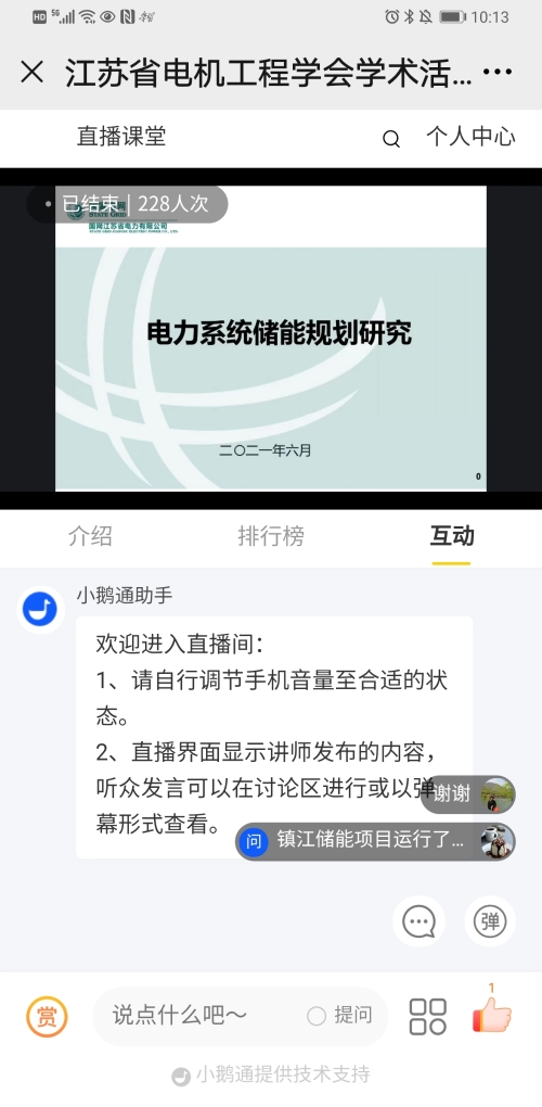 7月3日下午,江苏省电机工程学会成功举办系列线上讲座第十一期——《电力系统储能规划研究》。讲座采用网络直播的方式进行,特邀国网江苏经研院规划发展研究中心刘国静高工主讲。省电机工程学会各会员单位、专工委会、学生分会以及省内有关电力能源企业相关专业人员共220余人次在线观看了本次讲座。