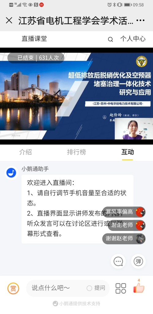 7月16日下午,江苏省电机工程学会成功举办系列线上技术讲座第十三期——《脱硝与空预器堵塞一体化治理技术研究》。讲座采用网络直播方式进行,特邀东南大学能源与环境学院博士生导师赵伶玲教授主讲。省电机工程学会各会员单位、专工委会、学生分会以及省内有关电力能源企业相关专业人员共1370余人次在线观看了本次讲座。
