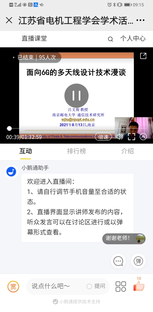 8月13日下午,江苏省电机工程学会举办2021年系列线上技术讲座第十六期——《面向6G的多天线设计技术漫谈》。讲座采用网络直播方式进行,特邀南京邮电大学教授、博士生导师吕文俊博士主讲。省电机工程学会各会员单位、专工委会、学生分会以及省内有关电力能源企业相关专业人员共90余人次在线观看了本次讲座。