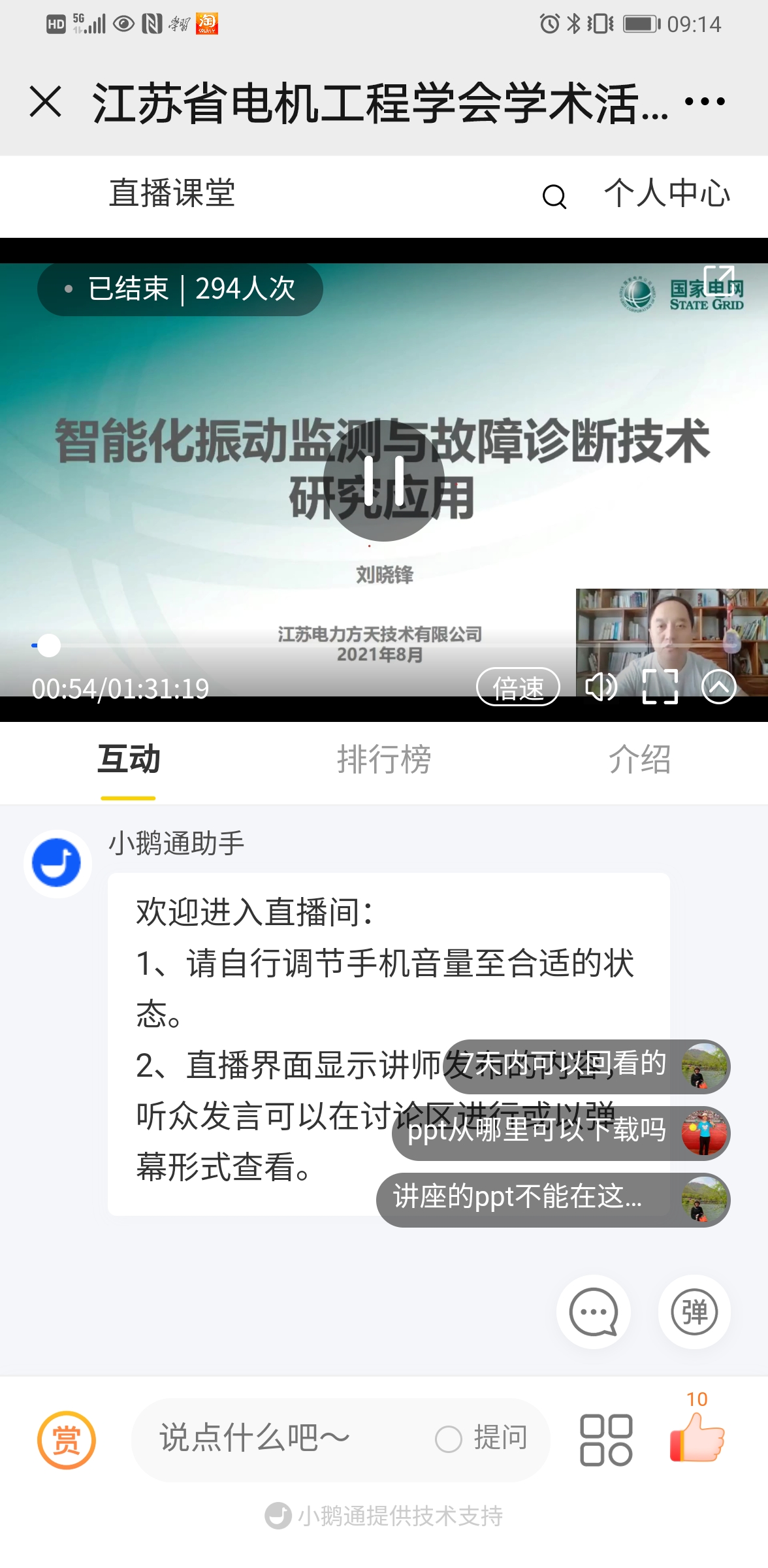 8月20日下午,江苏省电机工程学会举办2021年系列线上技术讲座第十七期——《智能化振动监测与故障诊断技术研究应用》。讲座采用网络直播方式进行,特邀江苏方天电力技术有限公司刘晓锋高工主讲。省电机工程学会各会员单位、专工委会、学生分会以及省内有关电力能源企业相关专业人员共290余人次在线观看了本次讲座。