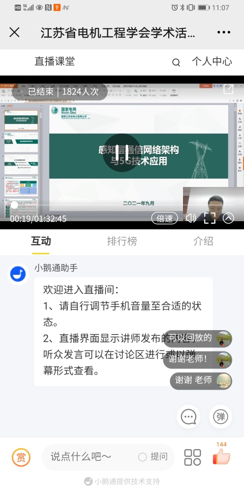 9月3日下午,江苏省电机工程学会举办2021年系列线上技术讲座第十八期——《感知层通信网络架构与5G技术应用》。讲座采用网络直播方式进行,特邀国网江苏省电力有限公司互联网部技术及建设处副处长蒋承伶高工主讲。省电机工程学会各会员单位、专工委会、学生分会以及省内有关电力能源企业相关专业人员共1820余人次在线观看或回看了本次讲座。
