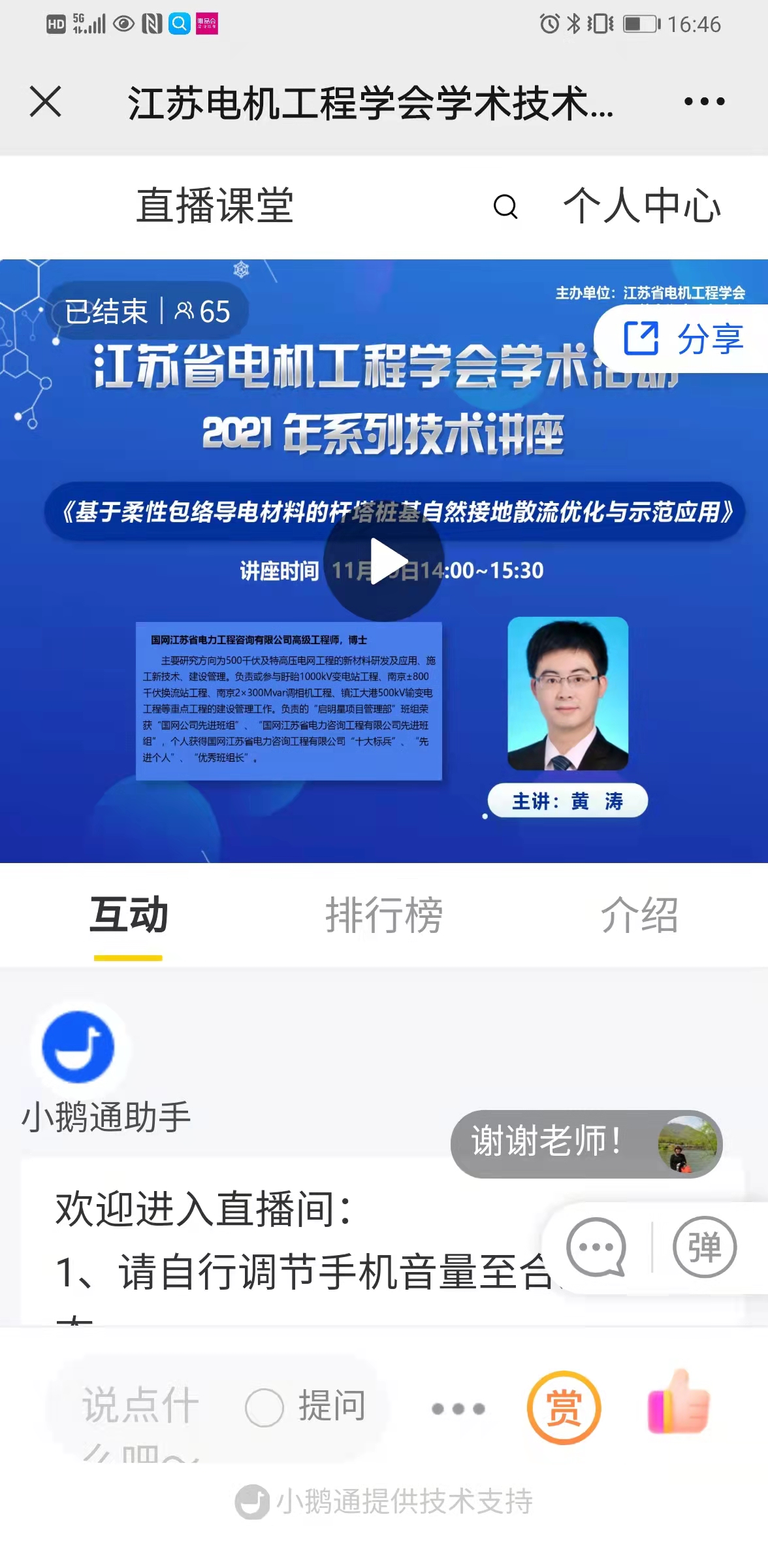 11月19日下午,江苏省电机工程学会采用网络直播方式举办2021年第二十三期线上讲座——《基于柔性包络导电材料的杆塔桩基自然接地散流优化与示范应用》,邀请国网江苏省电力工程咨询有限公司黄涛高工主讲。省电机工程学会各会员单位、专工委会、学生分会及省内电力企业共60余人次在线观看了本次讲座。