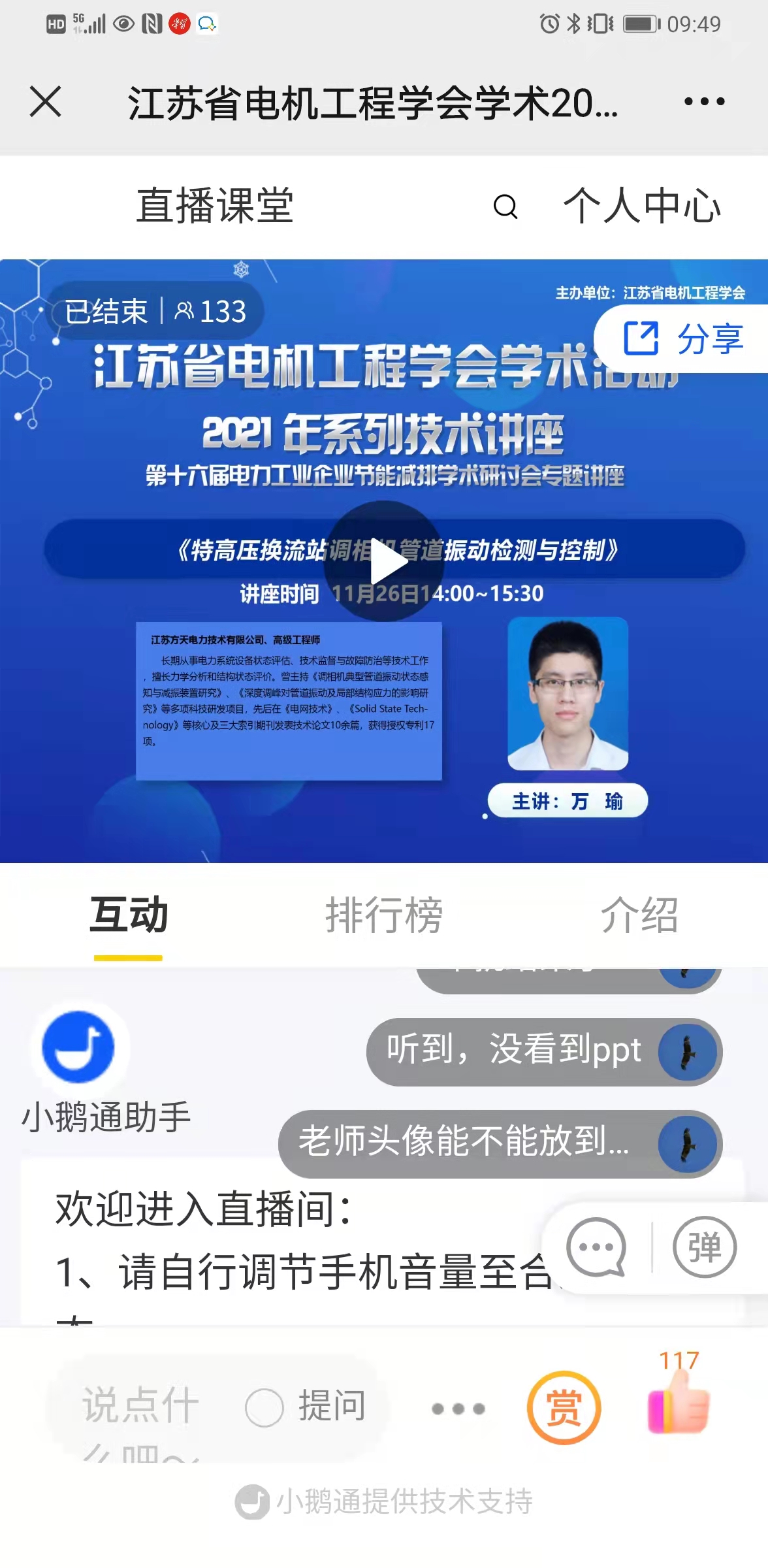 11月26日下午,江苏省电机工程学会采用网络直播方式举办2021年第二十四期线上技术讲座——《特高压换流站调相机管道振动检测与控制》,邀请江苏方天电力技术有限公司万瑜高工主讲。省电机工程学会各会员单位、专工委会、学生分会130余人在线观看了本次讲座。
