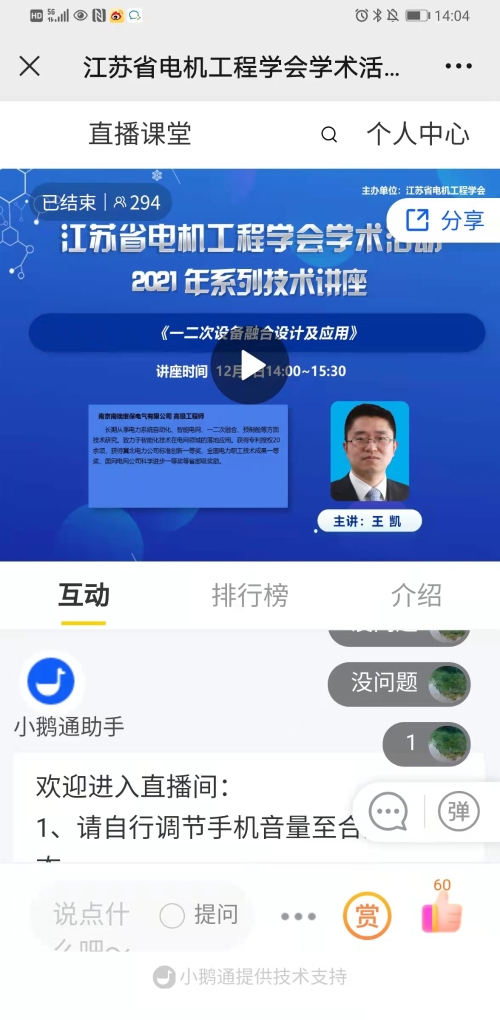 12月3日下午,江苏省电机工程学会采用网络直播方式举办2021年第二十五期线上技术讲座——《一二次设备融合设计及应用》,邀请南瑞继保电气有限公司王凯高工主讲。省电机工程学会各会员单位、专工委会、学生分会及省内电力企业共290余人次在线观看了本次讲座。