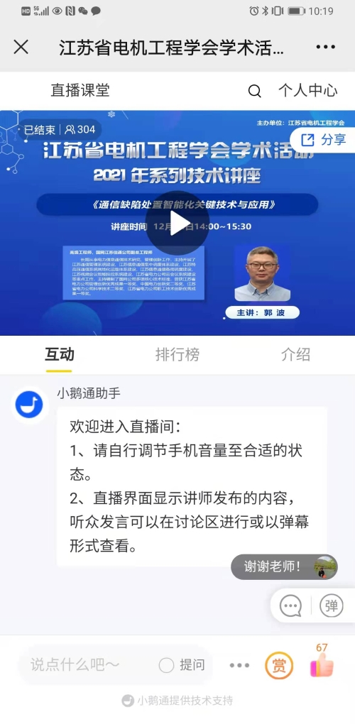 12月24日下午,江苏省电机工程学会采用网络直播方式举办2021年第二十八期线上讲座——《通信缺陷处置智能化关键技术与应用》,邀请国网江苏信息通信分公司副总工程师郭波高工主讲。省电机工程学会各会员单位、专工委会、学生分会及省内电力企业共300余人次在线观看了本次讲座。