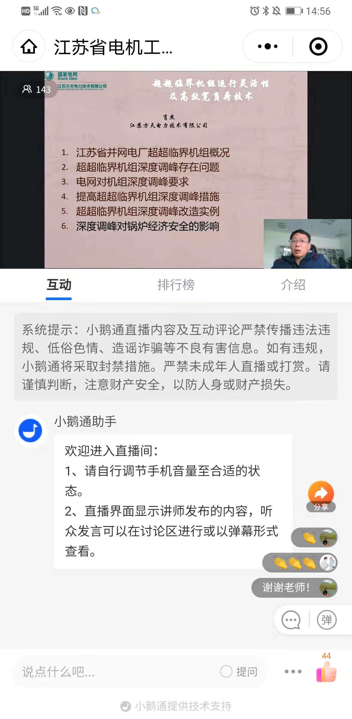 4月1日下午,江苏省电机工程学会成功举办2022年第三期线上讲座——《超超临界机组运行灵活性及高效宽负荷技术》,特邀江苏方天电力技术有限公司专家肖杰研究员级高工主讲。省电机工程学会各会员单位、专工委会、学生分会以及省内有关电力能源企业相关专业人员共140余人次在线观看或回看了本次讲座。