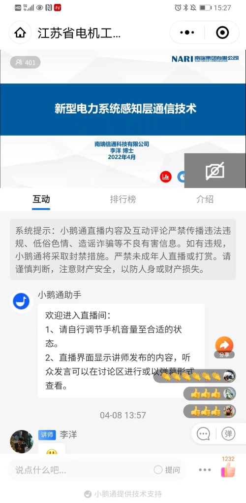 4月8日下午,江苏省电机工程学会成功举办2022年第4期线上讲座——《电力感知层通信技术》,特邀请南瑞信通科技有限公司通信业务部副总监李洋博士主讲。省电机工程学会各会员单位、专工委会、学生分会以及省内有关电力能源企业相关专业人员共400余人次在线观看或回看了本次讲座。
