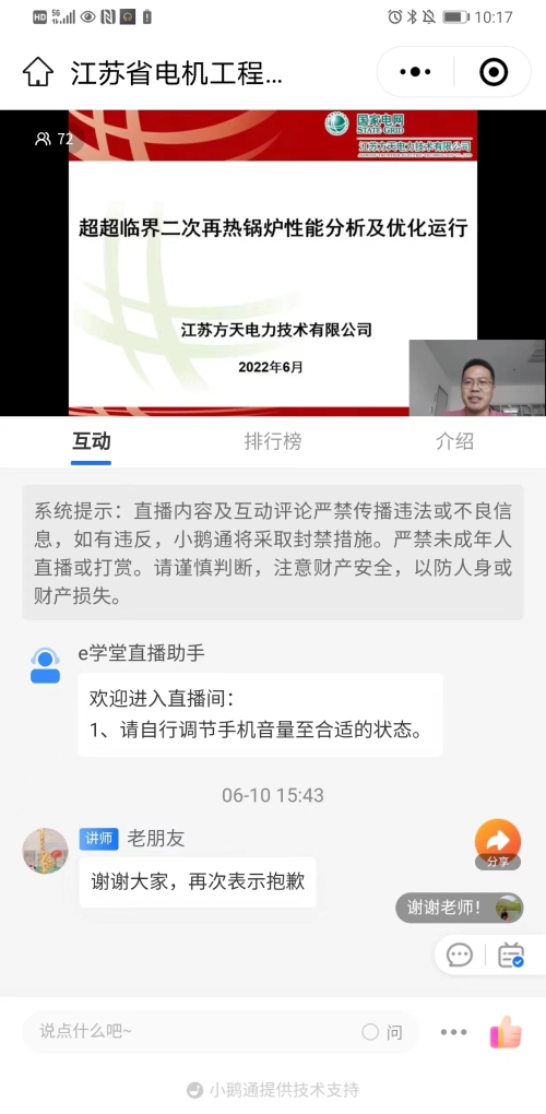 6月10日下午,江苏省电机工程学会成功举办第7期线上技术讲座——《超超临界二次再热锅炉性能分析及优化运行》,特邀请江苏方天电力技术有限公司岳峻峰研究员级高工主讲。省电机工程学会各会员单位、专工委会、学生分会以及省内有关电力能源企业相关专业人员70余位在线观看或回看了本次讲座。