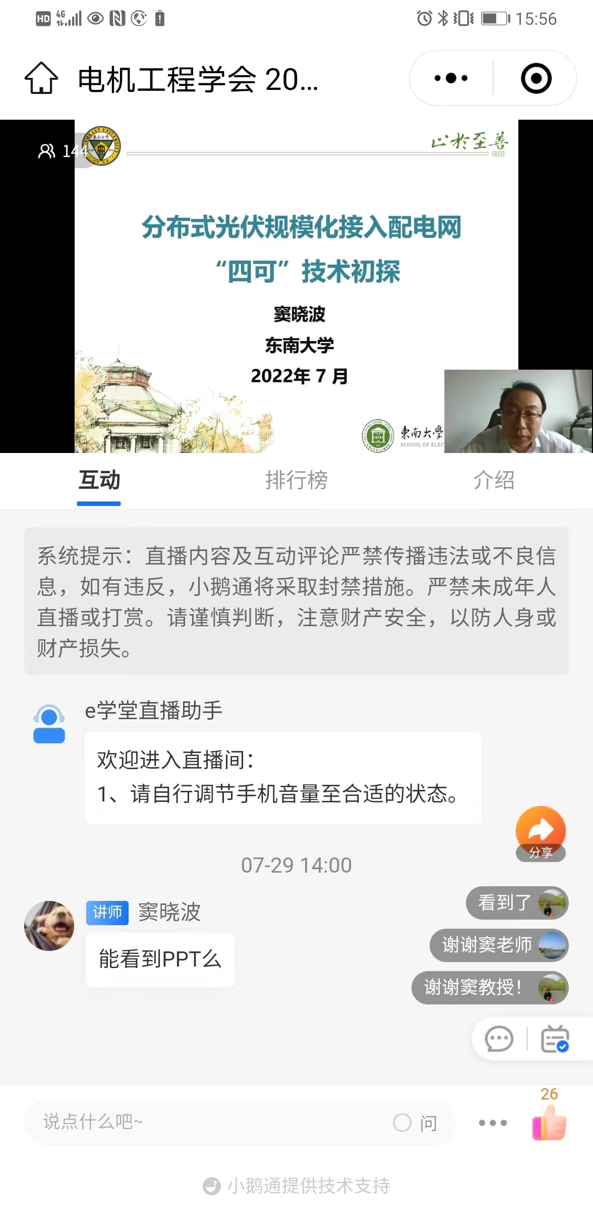 7月29日下午,江苏省电机工程学会成功举办2022年第十一期线上技术讲座——《分布式光伏规模化接入配电网可观可测可控可调关键技术初探》,特邀东南大学电气工程学院窦晓波教授主讲。省电机工程学会各会员单位、专工委会、学生分会以及省内有关电力能源企业相关专业人员140余位在线观看或回看了本次讲座。