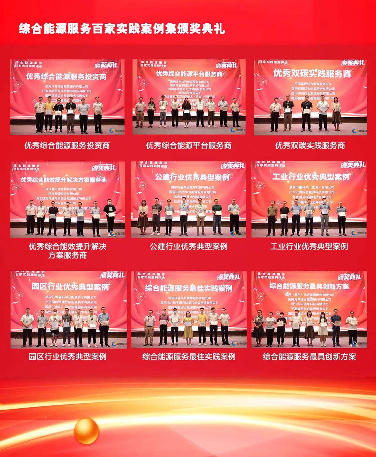 2021年综合能源服务百家实践案例集评选活动共计110个来自不同行业的案例参评,案例项目涉及到公建、工业、园区、区域能源、其他等五大行业。2022年3月1日-3月31日,通过线上评选+线下评选相结合,评选出9大奖项的获奖单位,并于2022年8月5日上午进行了综合能源服务百家实践案例集颁奖活动,九大奖项的获奖单位荣耀亮相。他们带着综合能源服务各类型落地案例的成果,为综合能源服务行业发展注入了强心剂。