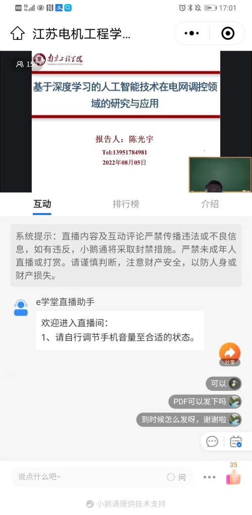 8月5日下午,江苏省电机工程学会成功举办2022年第十二期线上技术讲座——《基于深度学习的人工智能技术在电网调控领域的研究与应用》,特邀南京工程学院陈光宇副教授主讲。省电机工程学会各会员单位、专工委会、学生分会以及省内有关电力能源企业相关专业人员150余位在线观看或回看了本次讲座。