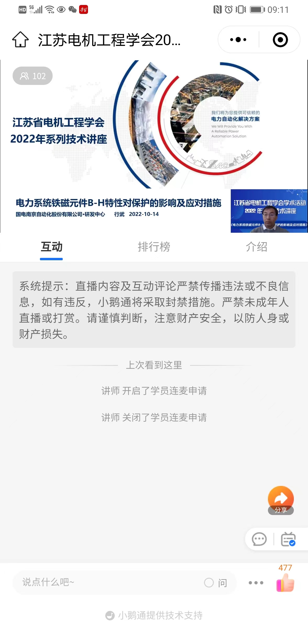 10月14日下午,江苏省电机工程学会成功举办2022年第十八期线上技术讲座,邀请国电南自研发中心高级设计师行武专家作《电力系统铁磁元件B-H特性对保护的影响及应对措施》专题报告。讲座采用网络直播方式进行,省电机工程学会各会员单位、专工委会、学生分会以及省内有关电力能源企业相关专业人员100余人次在线观看或回看了本次讲座。