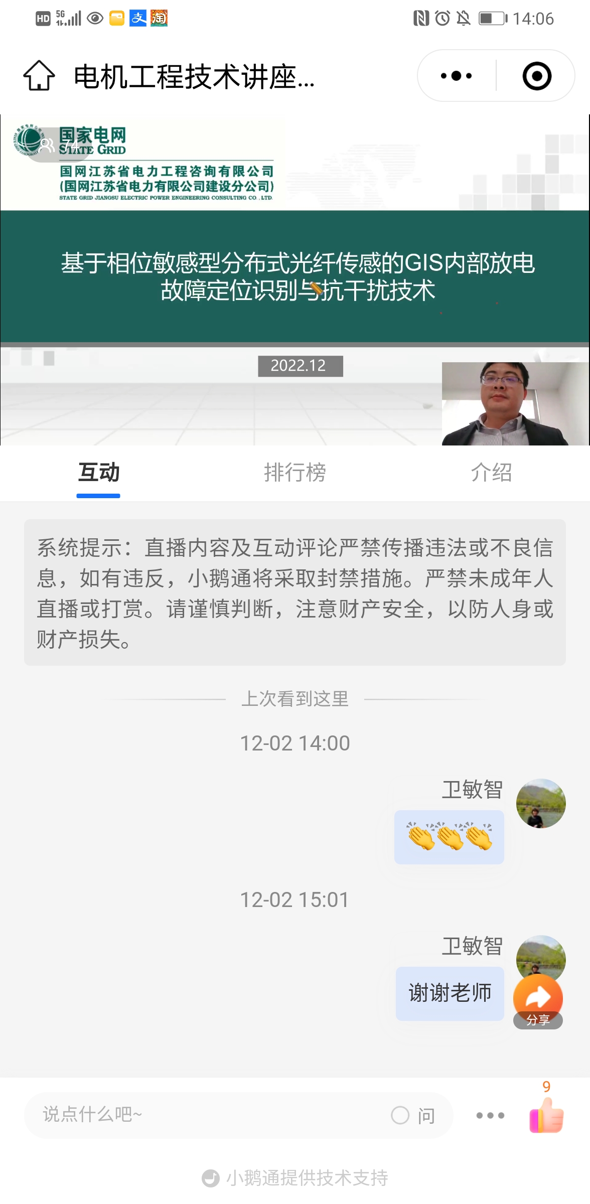 12月2日下午,江苏省电机工程学会成功举办2022年第二十三期线上技术讲座,邀请国网江苏省电力工程咨询有限公司黄涛高工作《基于相位敏感型分布式光纤传感的GIS内部放电故障定位识别与抗干扰技术》专题报告。讲座采用网络直播方式进行,省电机工程学会各会员单位、专工委会、学生分会以及省内有关电力能源企业相关专业人员70余人次在线观看或回看了本次讲座。