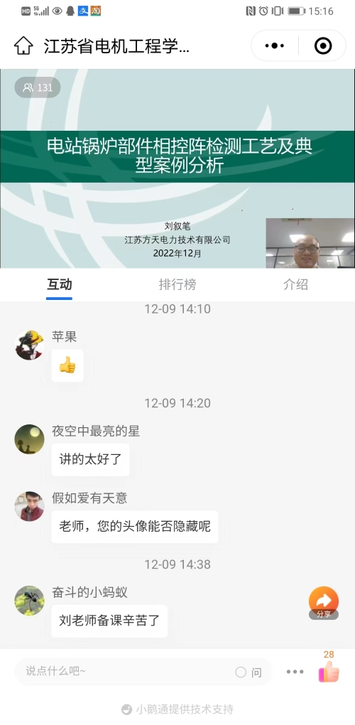 12月9日下午,江苏省电机工程学会成功举办2022年第二十四期线上技术讲座,邀请江苏方天电力技术有限公司检测实验技术中心刘叙笔高工作《电站锅炉部件相控阵检测工艺及典型案例分析》专题报告。讲座采用网络直播方式进行,省电机工程学会各会员单位、专工委会、学生分会以及省内有关电力能源企业相关专业人员130余人次在线观看或回看了本次讲座。