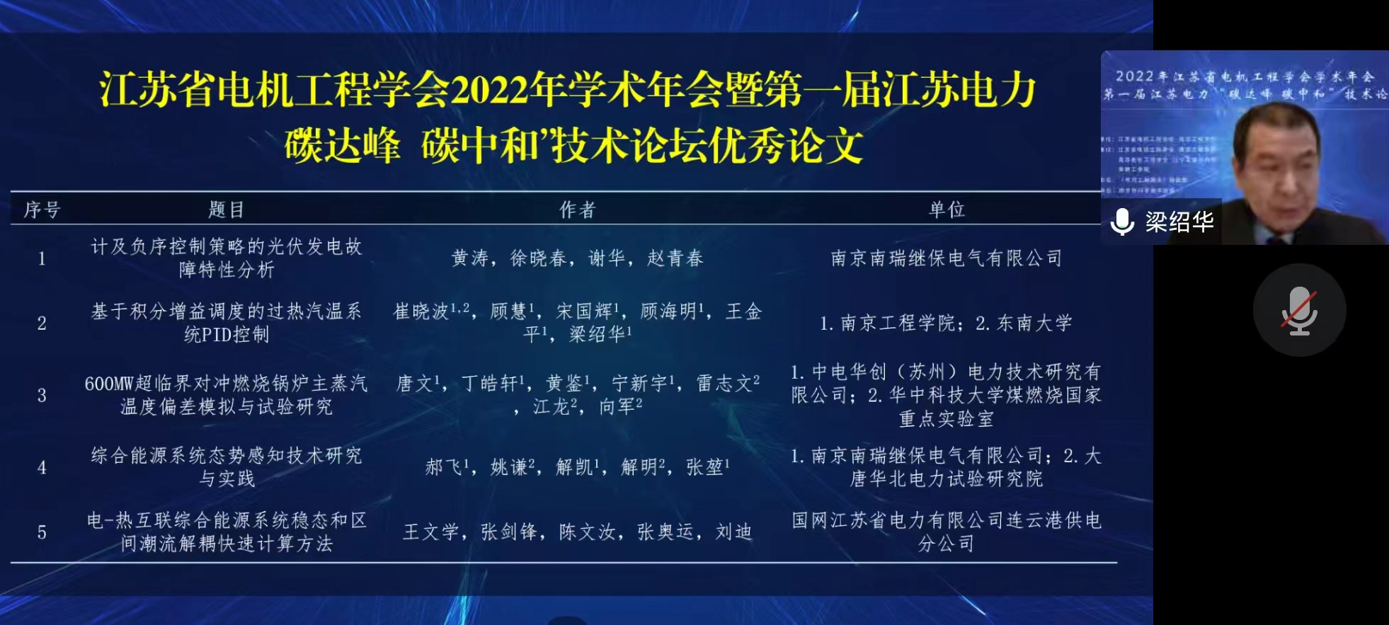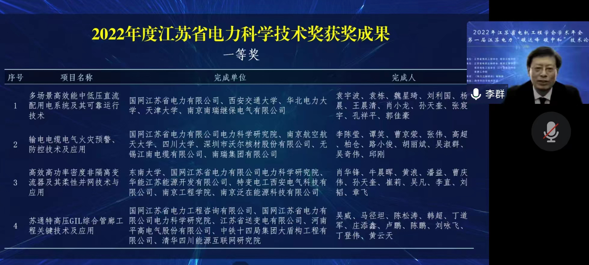 省电机工程学会理事、专(工)委会委员、学会会员,2022年度江苏省电机工程学会科学技术奖获奖项目完成人、江苏省电力优秀科技工作者奖和优秀青年工程师奖获奖人,2022年江苏省电机工程学会学术年会暨第一届江苏电力“碳达峰 碳中和”技术论坛论文作者,相关专家学者,电力企业、科研院所、高等院校等单位1300余名代表线上参加了会议。