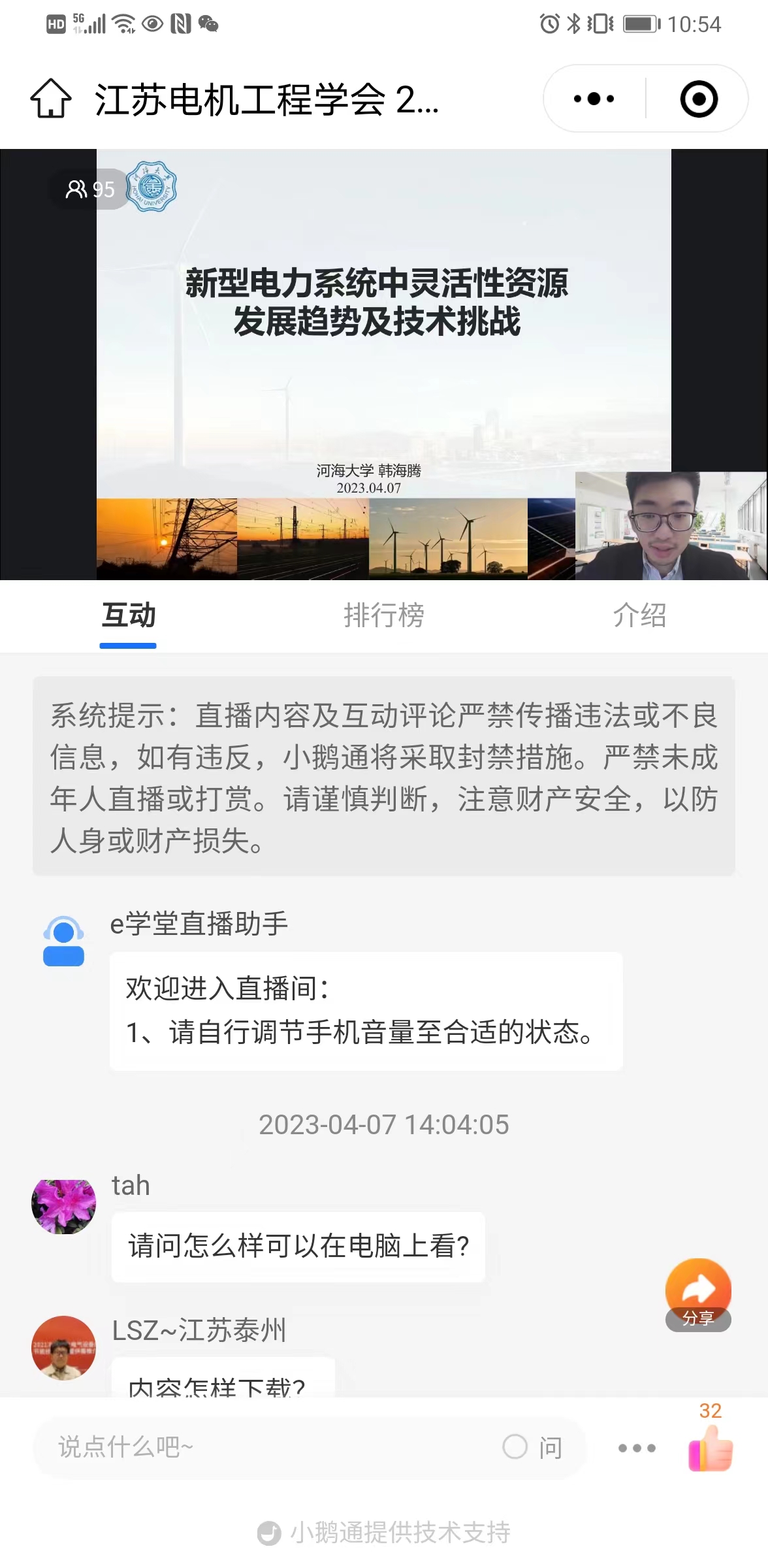 4月7日下午,江苏省电机工程学会成功举办2023年第二期线上讲座,邀请河海大学能源与电气学院硕士生导师韩海腾博士作《新型电力系统中灵活性资源发展趋势及技术挑战》技术报告。讲座采用网络直播的方式进行,省电机工程学会各会员单位、专工委会、学生分会以及省内有关电力能源企业相关专业人员90余人次在线观看或回看了本次讲座。
