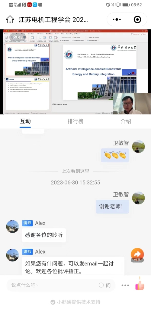 6月30日下午,江苏省电机工程学会成功举办2023年第十期线上讲座。讲座邀请华北电力大学电气与电子工程学院李超杰教授作《可再生能源与储能并网的人工智能方法研究》报告。讲座采用网络直播方式进行,省电机工程学会各会员单位、专工委会、学生分会以及省内有关电力能源企业相关专业人员40余人次在线观看了本次讲座。
