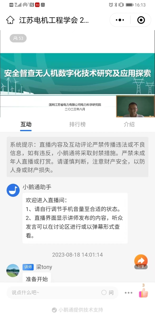 8月18日下午,江苏省电机工程学会成功举办2023年第十五期线上技术讲座。讲座邀请国网江苏电科院数字化技术中心副主任梁伟高级工程师作《安全督查无人机数字化技术研究及应用探索》报告。讲座采用网络直播方式进行,省电机工程学会各会员单位、专工委会、学生分会以及省内有关电力能源企业相关专业人员50余人次在线观看了本次讲座。
