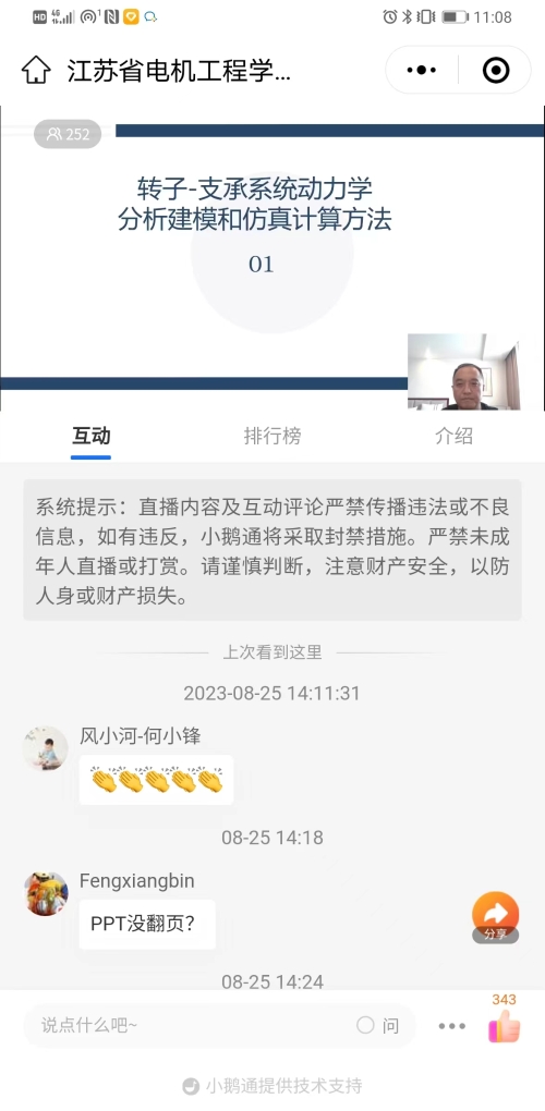 8月25日下午,江苏省电机工程学会成功举办2023年第十六期线上技术讲座。讲座邀请江苏方天电力技术有限公司热能动力中心刘晓锋博士、高级工程师作《转子轴承系统典型振动故障机理建模及动力响应分析》技术报告。省电机工程学会各会员单位、专工委会、学生分会以及省内有关能源电力企业250余位相关专业人员在线观看了本次讲座。