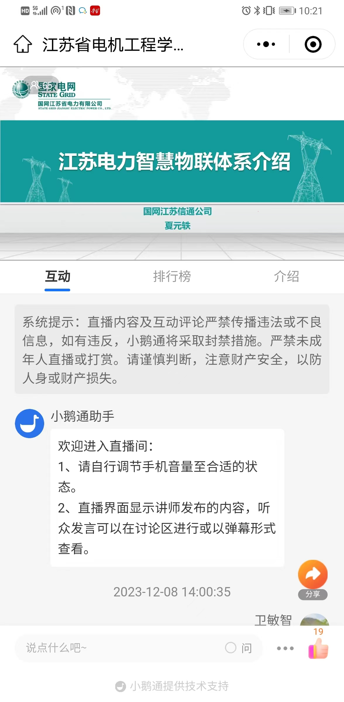 12月8日下午,江苏省电机工程学会成功举办2023年第二十五期线上讲座。讲座邀请国网江苏省电力有限公司信息通信分公司数字电网中心五级职员夏元轶高工作《江苏电力智慧物联体系介绍》报告。省电机工程学会各会员单位、专工委会、学生分会以及省内有关电力能源企业相关专业人员60余人次在线观看了本次讲座。