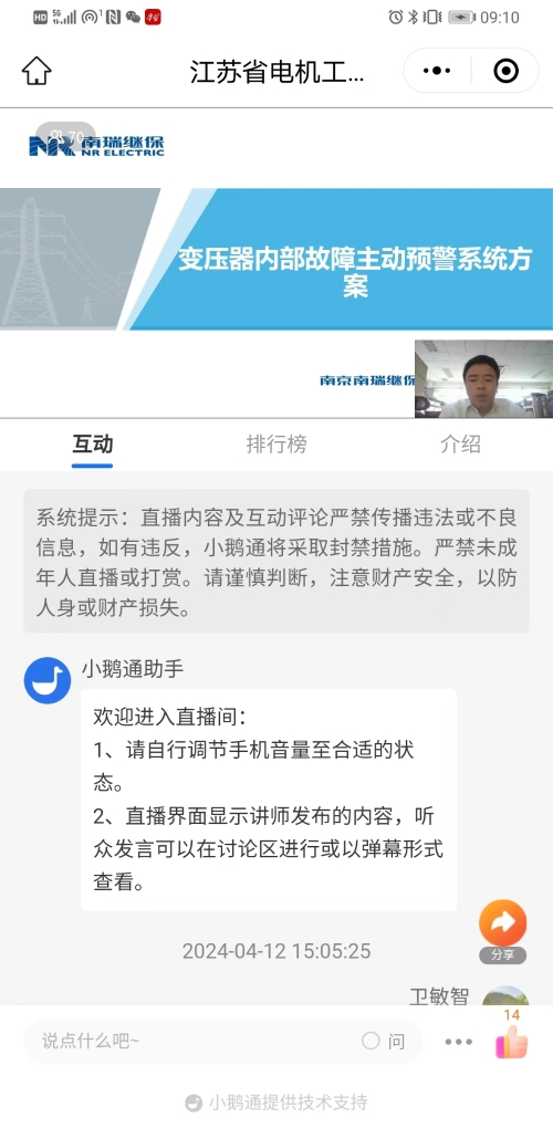 4月12日下午,江苏省电机工程学会成功举办2024年第三期线上讲座。讲座邀请南京南瑞继保电气有限公司顾乔根高级工程师作《变压器内部故障主动预警系统方案》报告。省电机工程学会各会员单位、专工委会、学生分会以及省内有关电力能源企业相关专业人员70余人次在线观看了本次讲座。