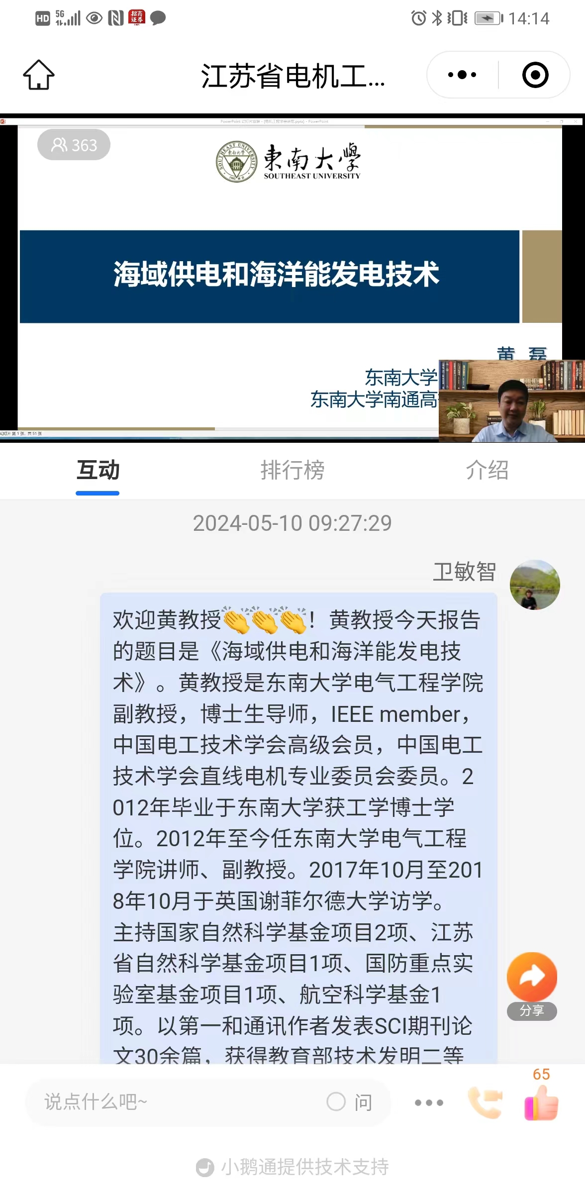 5月10日上午,江苏省电机工程学会举办2024年第六期线上讲座。讲座邀请东南大学电气工程学院博士生导师黄磊副教授作《海域供电和海洋能发电技术》报告。省电机工程学会各会员单位、专工委会、学生分会以及省内有关电力能源企业相关专业人员260余人次在线观看了本次讲座。
