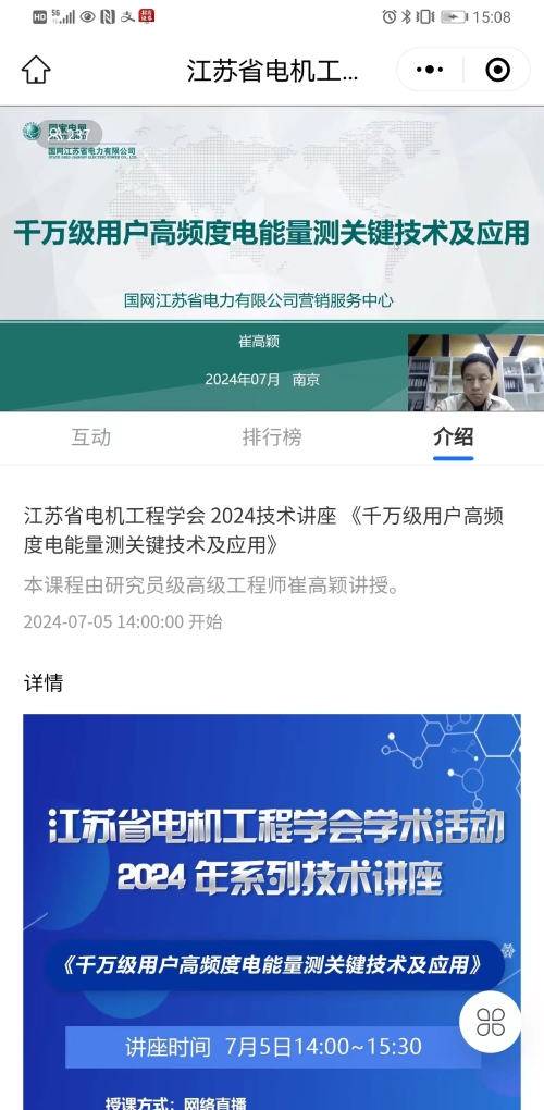 7月5日下午,江苏省电机工程学会举办2024年第十二期线上技术讲座。讲座邀请国网江苏营销服务中心五级专家崔高颖研究员级高工作《千万级用户高频度电能量测关键技术及应用》报告。省电机工程学会各会员单位、专工委会、学生分会以及省内有关电力能源企业相关专业人员230余人次在线观看了本次讲座。