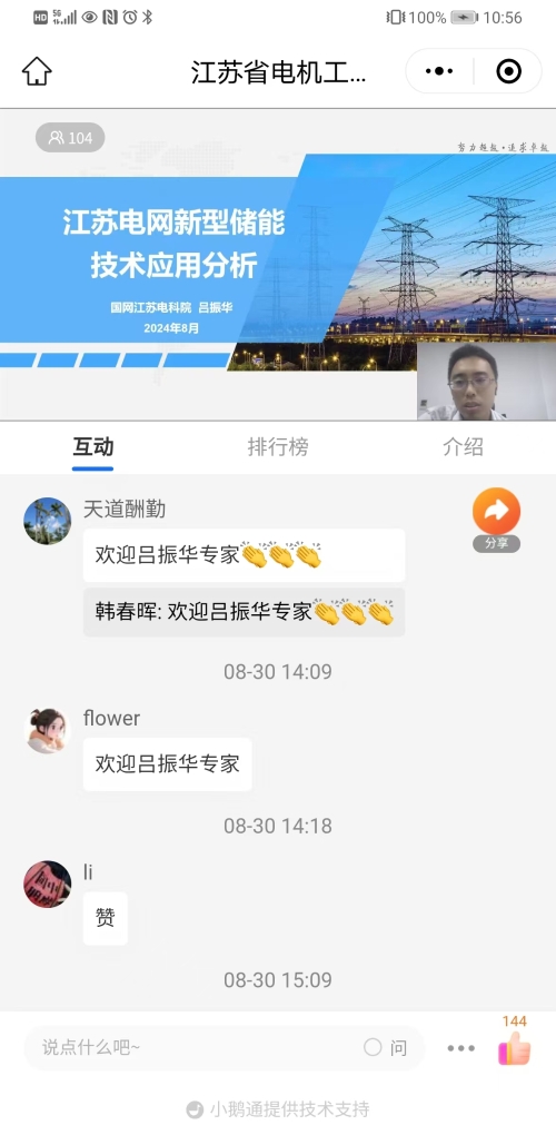 8月30日下午,江苏省电机工程学会举办2024年第十六期线上讲座。讲座邀请国网江苏省电力有限公司电力科学研究院五级专家吕振华高工作《江苏电网新型储能技术应用分析》报告。省电机工程学会各会员单位、专工委会、学生分会以及省内有关电力能源企业相关专业人员100余人次在线观看了本次讲座。