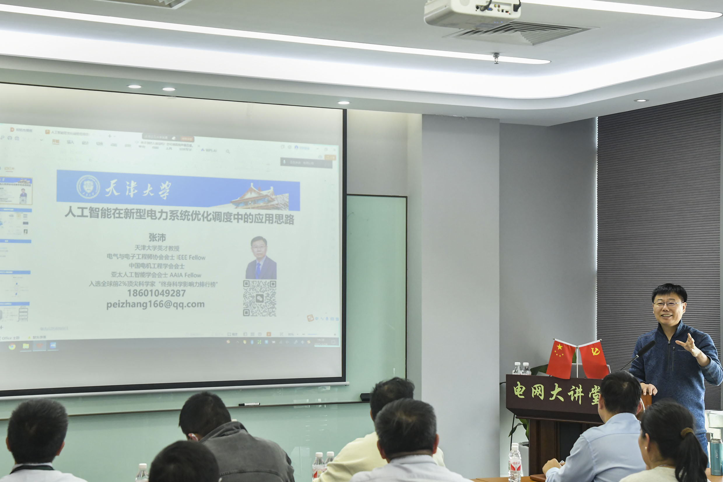 本次讲座聚焦人工智能技术在新型电力系统中的应用实践和未来发展思考。张沛教授从四个关键方面进行了深入讲解:一是人工智能在确定性优化调度中的应用;二是人工智能在考虑不确定性优化调度中的作用;三是电力系统智能计算的最新进展;四是人工智能在未来调控中心的应用展望。张教授的讲演内容详实、案例丰富,引发了参会人员的浓厚兴趣。