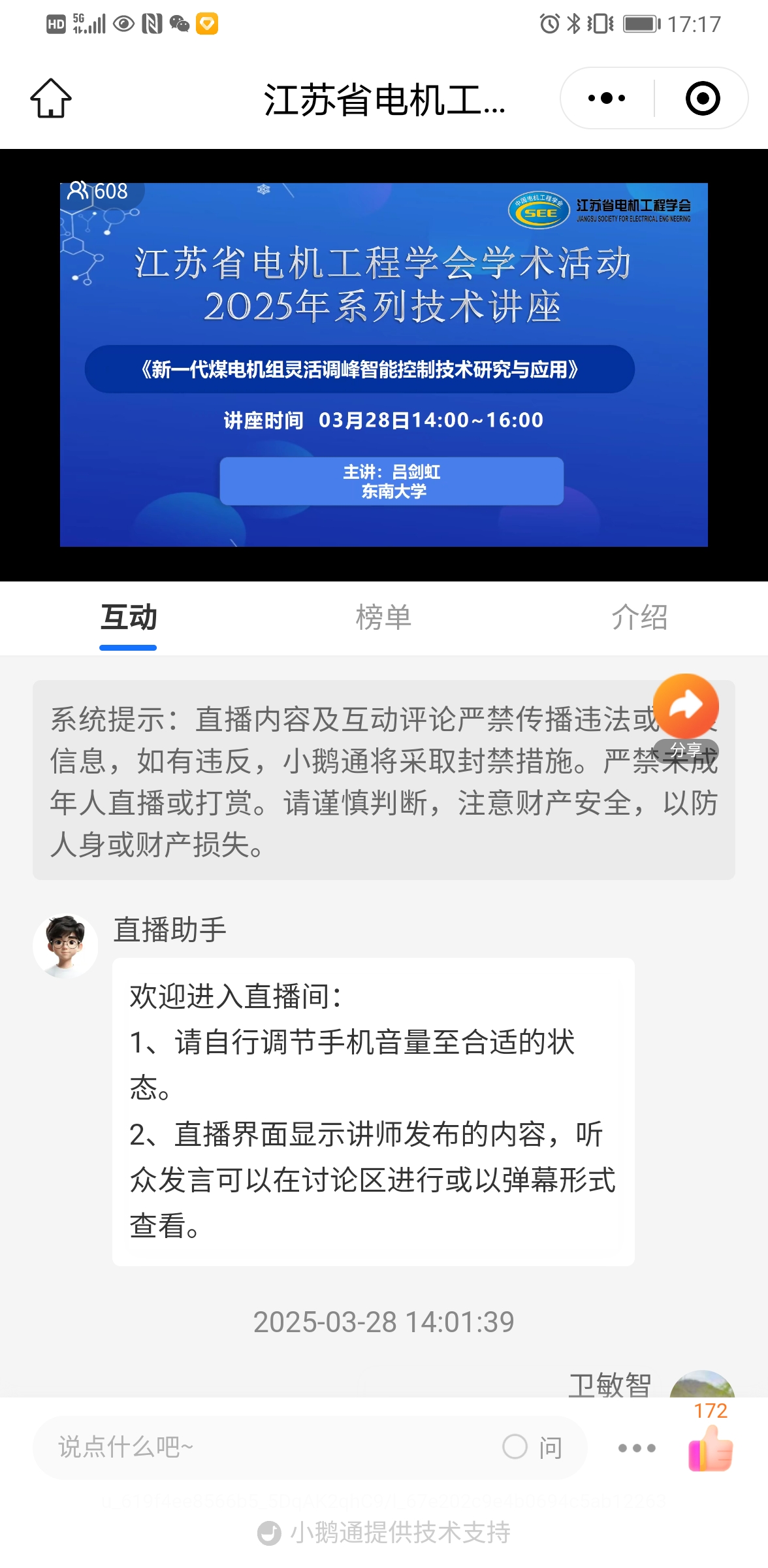 3月28日下午,江苏省电机工程学会举办2025年第三期线上讲座。讲座邀请东南大学能源与环境学院吕剑虹教授作《新一代煤电机组灵活调峰智能控制技术研究与应用》技术讲座。省电机工程学会各会员单位、专工委会、学生分会以及省内有关电力能源企业相关专业人员600余人次在线观看了本次讲座。