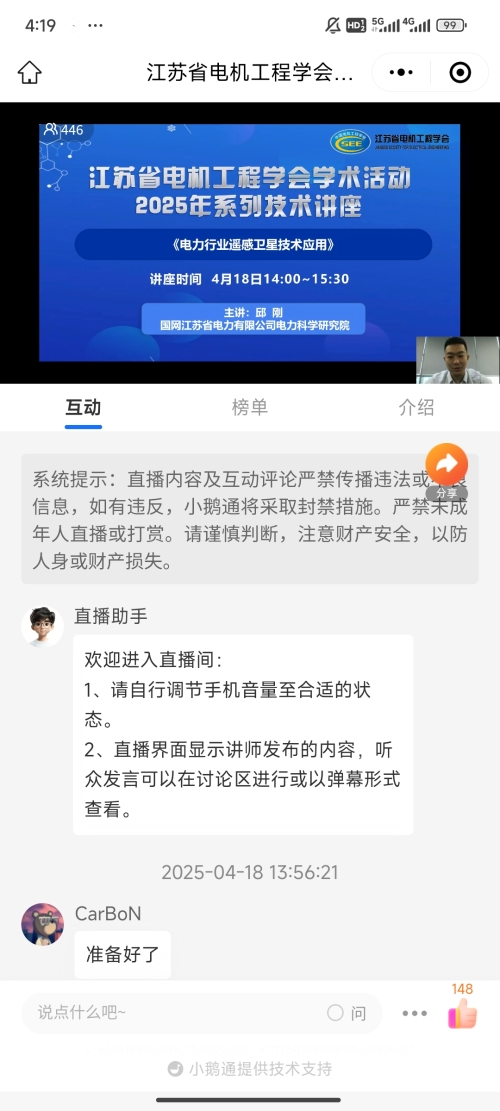 4月18日下午,江苏省电机工程学会举办2025年第五期线上讲座。讲座邀请国网江苏省电力科学研究院邱刚博士作《电力行业遥感卫星技术应用》讲座。省电机工程学会各会员单位、专工委会、学生分会以及省内有关电力能源企业相关专业人员440余人次在线观看了本次讲座。