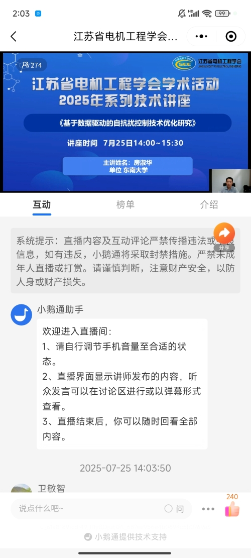 7月25日下午,省电机工程学会举办2025年第14期线上讲座。讲座邀请东南大学电气学院房淑华教授作《基于数据驱动的自抗扰控制技术优化研究》报告。省电机工程学会各会员单位、专工委会、学生分会以及相关专业人员200余人次在线观看了本次讲座。