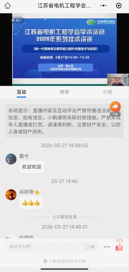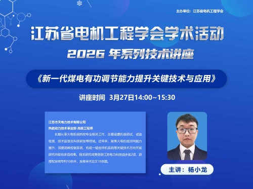 3月27日,省电机工程学会举办2026年第2期线上讲座。讲座邀请江苏方天电力技术有限公司杨小龙高工作《新一代煤电深度调峰有功调节能力提升关键技术与应用案例》报告。学会各会员单位、专工委会、学生分会以及省内有关电力能源企业相关专业人员300余人次在线观看了本次讲座。