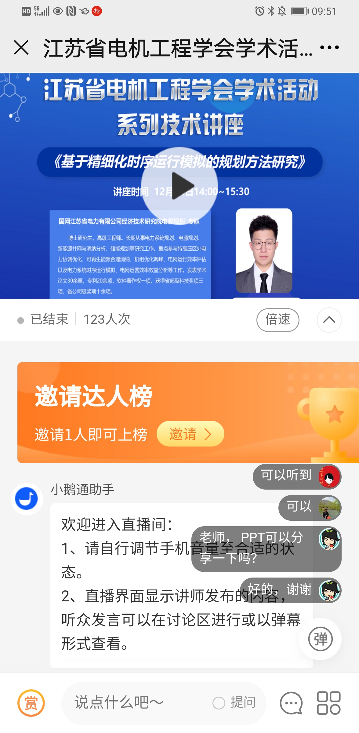 12月18日下午,江苏省电机工程学会成功举办系列技术讲座——《基于精细化生产模拟的规划方法研究交流》。讲座采用网络直播方式进行,特邀国网江苏经研院葛毅博士主讲。省电机工程学会各会员单位、专工委会、学生分会120余人次在线观看了本次讲座。