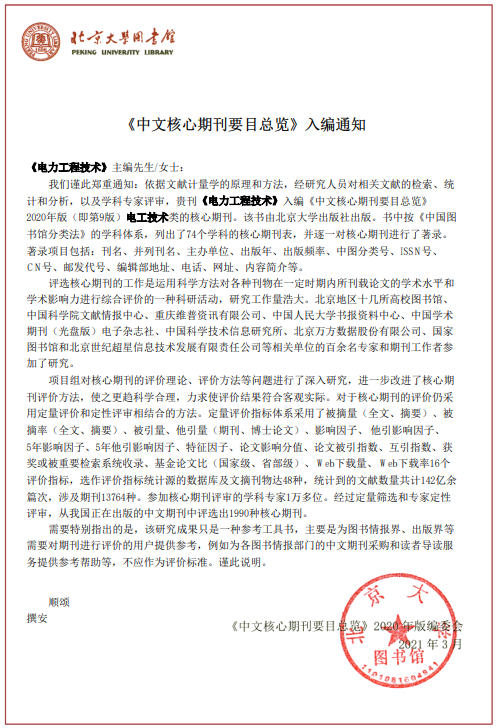 据了解,北京大学《中文核心期刊要目总览》是目前我国最重要的学术期刊评价体系之一,为学术界广泛认可,具有重要影响力。《电力工程技术》期刊入编中文核心期刊,充分体现了专家学者对《电力工程技术》办刊思路的认同及刊物质量的认可。近年来,《电力工程技术》期刊坚持理论研究与工程实践相结合的办刊特色,密切跟踪电力工程技术热点问题和技术发展,积极刊载新技术在电力工程中的应用研究、电力工程领域创新性学术及技术成果,大力传播电力工程领域新理论、新技术、新方法,期刊学术地位迅速提升。《电力工程技术》的影响因子、总被引频次和综合评价等各项指标在我国电气工程领域期刊中均步入第一方阵,短短三年即先后获评中国科技核心期刊、日本科学技术振兴机构数据库(JST)收录期刊、RCCSE中国核心学术期刊(A)、北大中文核心期刊。