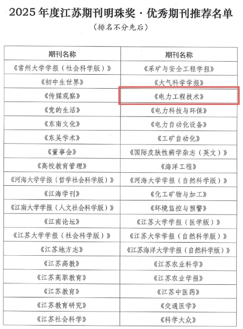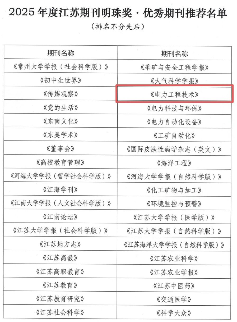 近日,由江苏省电机工程学会和国网江苏省电力有限公司共同主办的《电力工程技术》期刊获评“2025年江苏期刊明珠奖·优秀期刊”,彰显了江苏省期刊协会评委专家对《电力工程技术》坚持理论与实践并重的办刊理念和高质量办刊水平的充分肯定。
