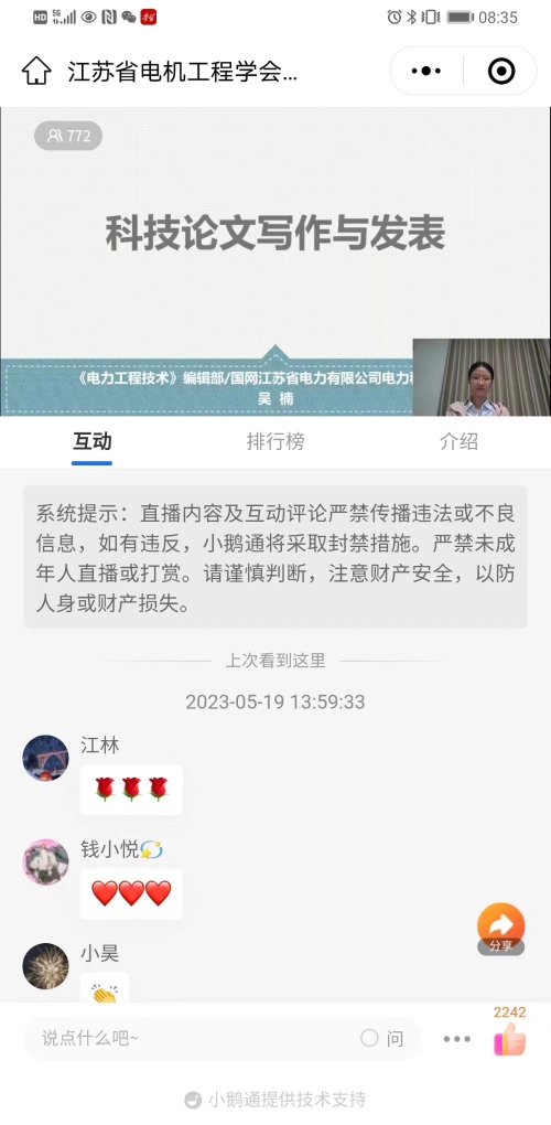 5月19日下午,江苏省电机工程学会成功举办2023年第六期线上讲座。讲座邀请《电力工程技术》编辑部学术编辑、国网江苏电科院吴楠博士作《科技论文写作与发表》的培训。讲座采用网络直播的方式进行,省电机工程学会各会员单位、专工委会、学生分会以及省内有关电力能源企业相关专业人员770余人次在线观看了本次讲座。