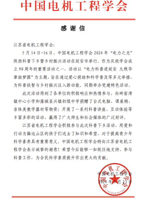 5月23日,中国电机工程学会发来感谢信,对江苏省电机工程学会在2024年中国电机工程学会“电力之光”陕西科普下乡暨乡村振兴活动活动中的大力支持表示感谢。