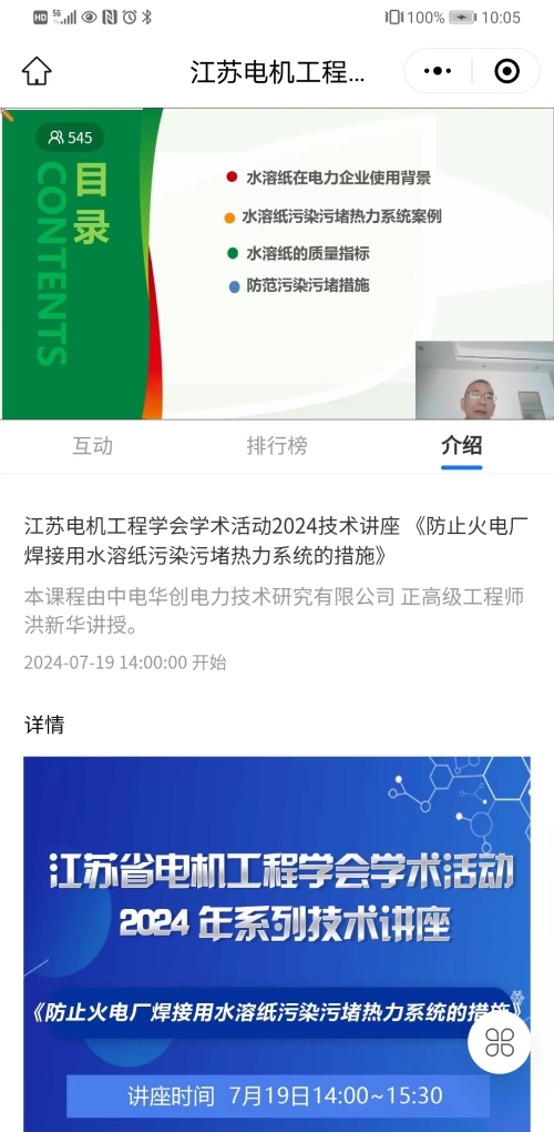 7月19日下午,江苏省电机工程学会举办2024年第十三期线上讲座。讲座邀请中电华创电力技术研究有限公司洪新华正高级工程师作《防止火电厂焊接用水溶纸污染污堵热力系统的措施》报告。省电机工程学会各会员单位、专工委会、学生分会以及省内有关电力能源企业相关专业人员540余人次在线观看了本次讲座。