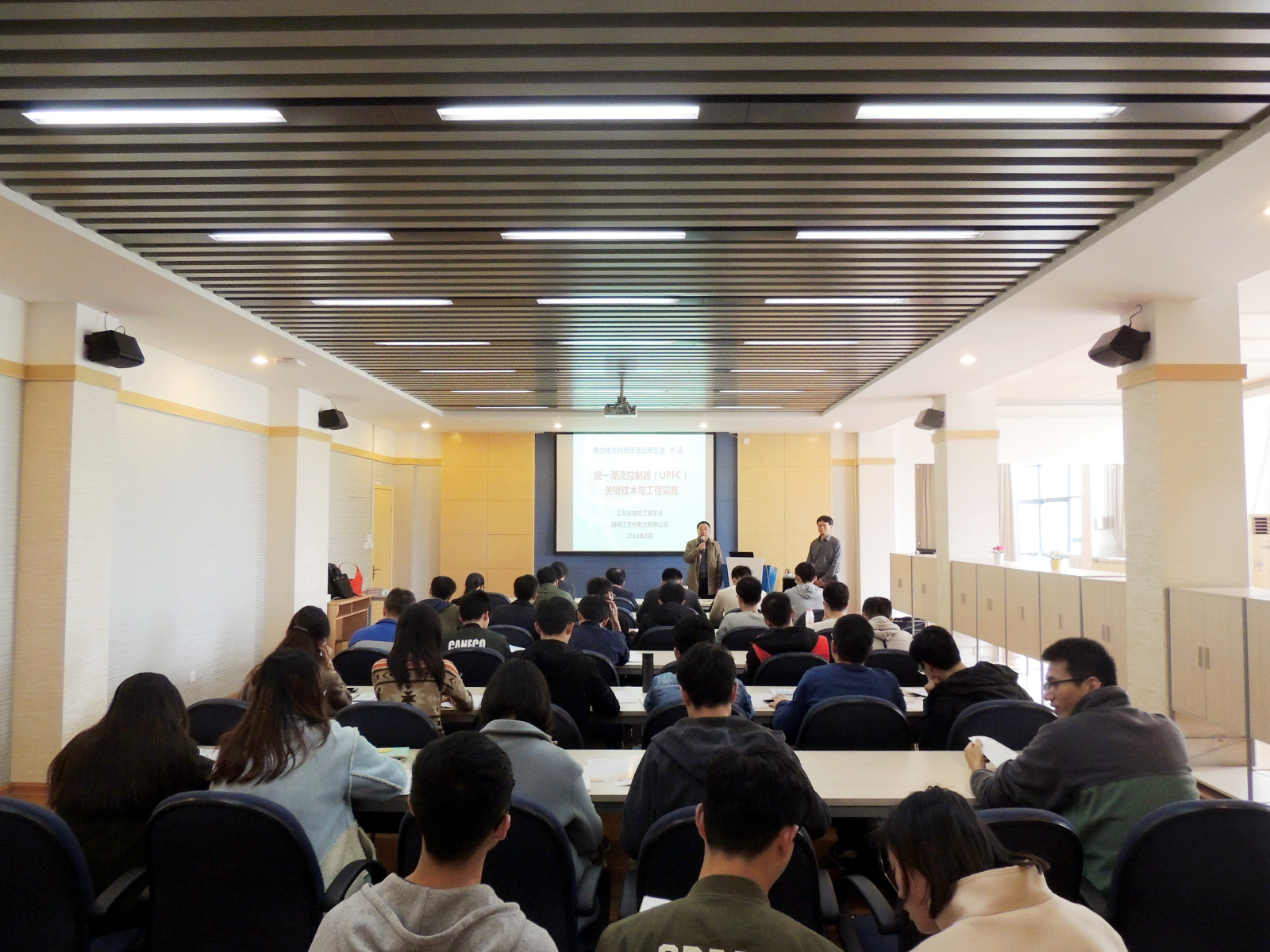 3月15日,江苏省电机工程学会在河海大学举办了“电力重大科技示范应用进校园”系列活动的第二场讲座。省电机工程学会常务理事兼副秘书长、国网江苏电科院副院长李群为广大师生作了“统一潮流控制器(UPFC)关键技术与工程实践”的专题讲座,河海大学能源与电气学院院长吴峰教授出席并主持活动。来自河海大学能源与电气学院的50多名师生参加了讲座。