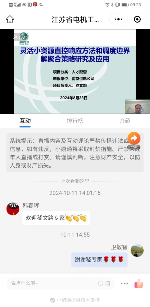10月11日下午,江苏省电机工程学会举办2024年第十九期线上讲座。讲座邀请国网南京供电公司二次系统专职、国网江苏省电力有限公司三级专家嵇文路研究员级高工作《多类型可调资源在城市电网调控中的价值和实践》技术报告。省电机工程学会各会员单位、专工委会、学生分会以及省内有关电力能源企业相关专业人员170余人次在线观看了本次讲座。