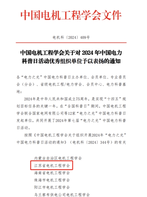 日前,中国电机工程学会发布《中国电机工程学会关于对2024年中国电力科普日活动优秀组织单位予以表扬的通知》(电机科〔2024〕409号),对50个在2024年中国电力科普日活动组织中表现突出的单位予以表扬,江苏省电机工程学会榜上有名。