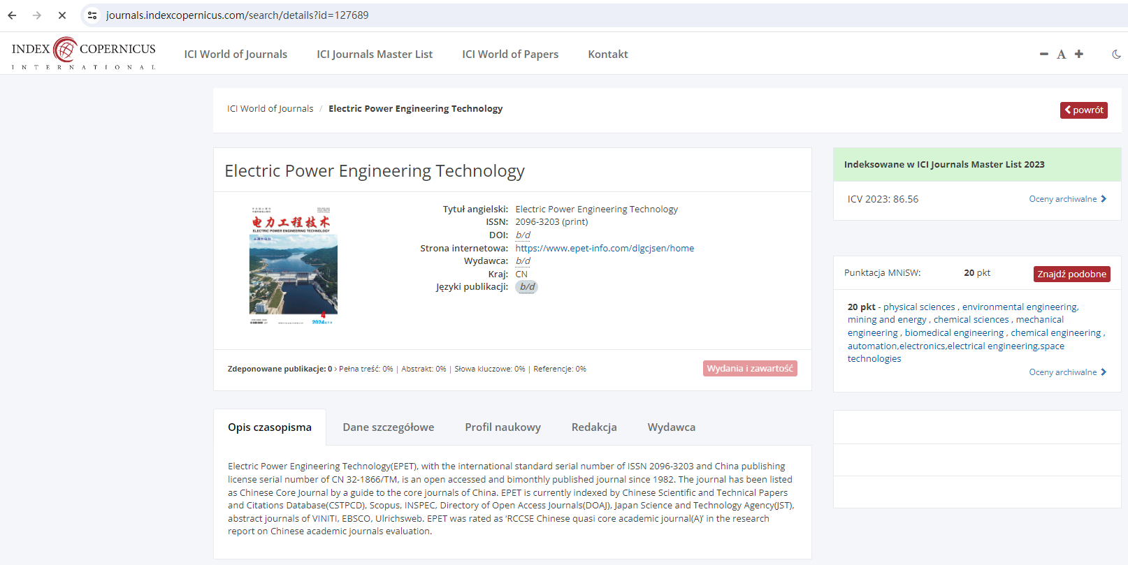 ICI Journals Master List是国际科学期刊索引数据库,它基于100多项指标对期刊进行多维度评价,达标期刊将获得ICV(Index Copernicus Value)指数,该指数反映期刊发展水平及其在科学界的影响力。ICI Journals Master List是少数每年进行详细评估的数据库之一,也是波兰唯一的科学领域全球品牌。