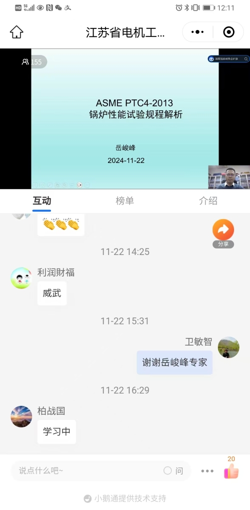 11月22日下午,省电机工程学会成功举办第二十三期线上讲座。讲座邀请江苏方天电力技术有限公司岳峻峰正高级工程师作《ASME PTC 4-2013锅炉性能试验规程解析》技术培训。省电机工程学会各会员单位、专工委会、学生分会以及省内有关电力能源企业相关专业人员150余人次在线观看了本次讲座。