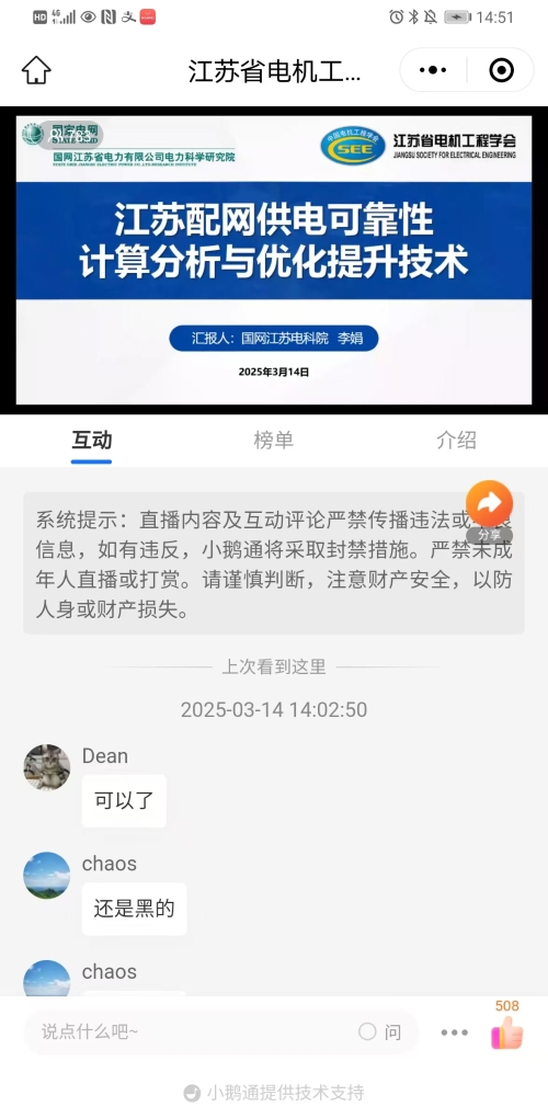 3月14日下午,省电机工程学会举办2025年第一期线上讲座。讲座邀请国网江苏省电力有限公司电力科学研究院高级工程师李娟博士作《江苏配网供电可靠性计算分析与优化提升技术》讲座。省电机工程学会各会员单位、专工委会、学生分会以及省内有关电力能源企业相关专业人员780余人次在线观看了本次讲座。