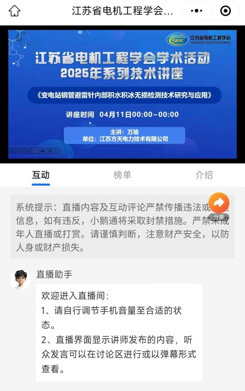 4月11日下午,江苏省电机工程学会举办2025年第四期线上讲座。讲座邀请江苏方天电力技术有限公司万瑜高工作《变电站钢管避雷针内部积水积冰无损检测技术研究与应用》技术讲座。省电机工程学会各会员单位、专工委会、学生分会以及省内有关电力能源企业相关专业人员200余人次在线观看了本次讲座。