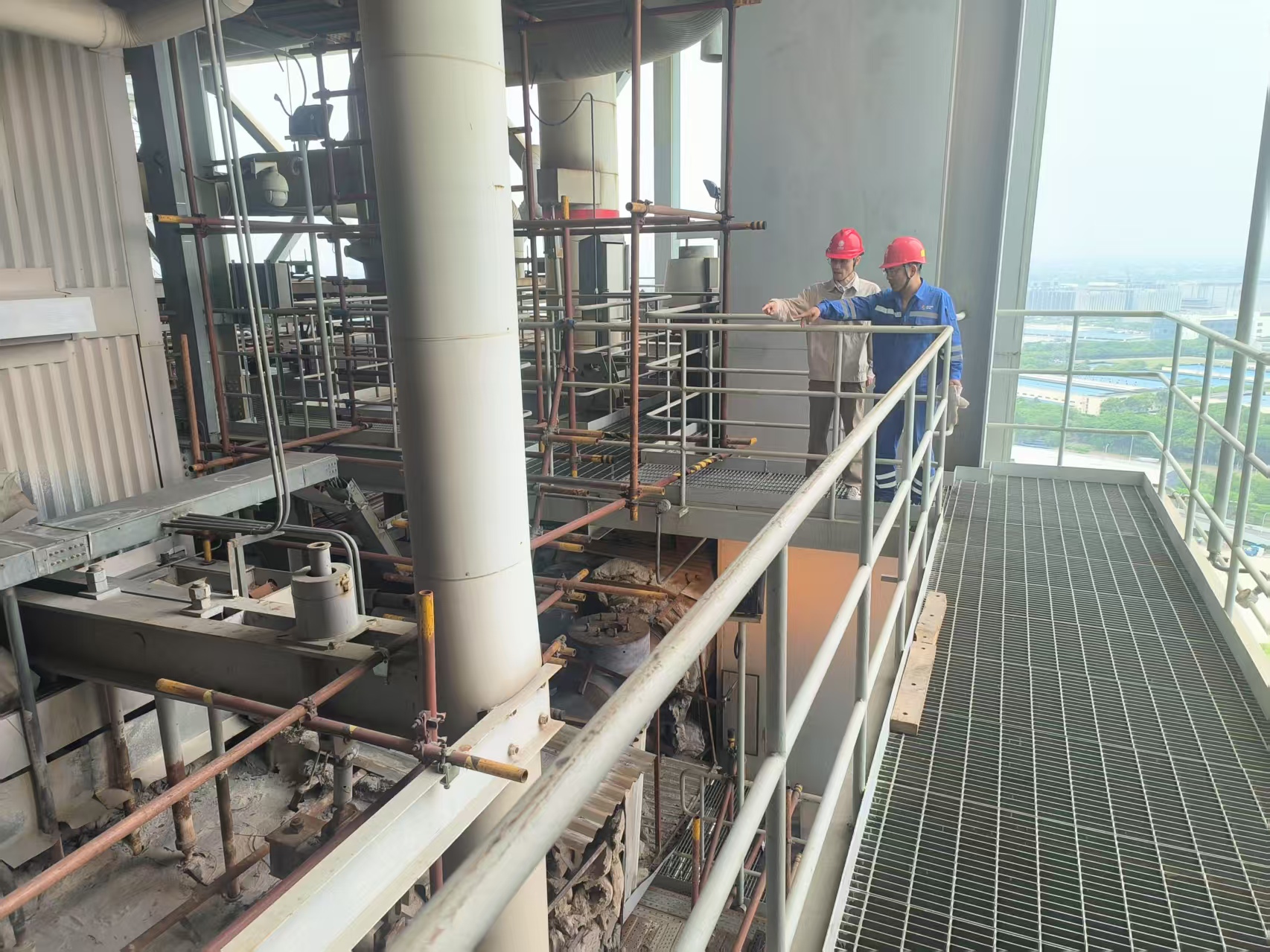 服务期间,金属与焊接专委会针对困扰电厂生产安全的1000MW塔式炉二级再热器出口集箱的支吊架异常问题开展了专项现场服务,专家协同电厂专业技术人员从集箱结构设计、锅炉膨胀、集箱与管道协调变形以及支吊架结构功能等进行了全方位的技术分析。双方确认了二级再热器支吊架的设计形式与现场不一致的情况,并指出现场吊杆过短的安装形式是造成支吊架倾斜超标的直接原因,可通过改造支吊架的生根结构改善目前的问题,保障集箱的整体结构受载平衡。电力环保专委会专家针对电厂脱硫系统存在浆液泡沫多、液位控制困难、循环浆液停留时间短、脱水石膏品质下降、含水超标等问题提出了好的建议。